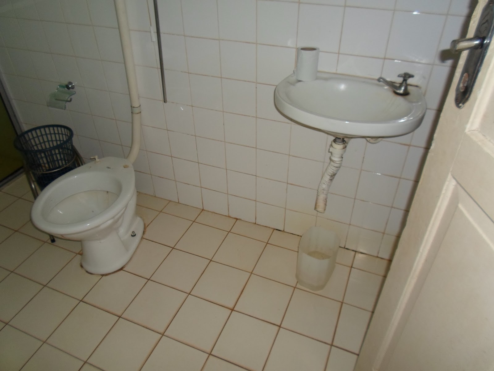 Nas fotos podemos observar: banheiros com vazamentos, chuveiro de banho sendo aberto com alicate em vez de um registro, um depósito cheio de macas enferrujando etc.