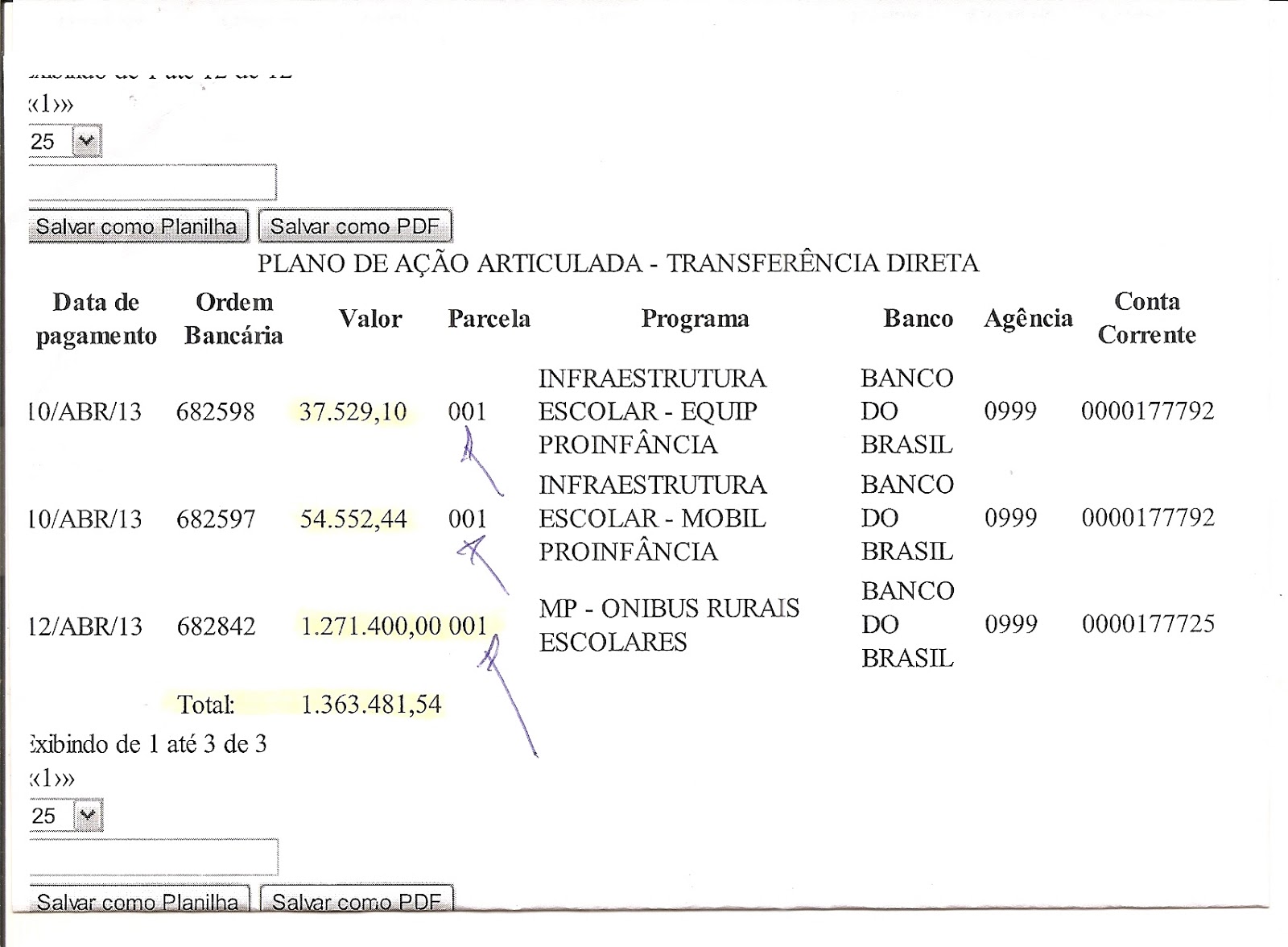Já está depositado na conta da  Prefeitura Municipal de Una, conta nº 0000177725- Ag 999-7 do Banco do Brasil de Una R$ 1.271.400 ( Hum milhão duzentos e setenta e um mil quatrocentos  reais)  para a compra de 5 (cinco) ônibus 0km.