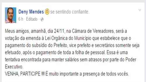 O Presidente da Câmara de vereadores da cidade de Canavieiras no Sul da Bahia, vereador Deny Mendes, publicou na sua rede social nesta segunda-feira (23), que irá colocar em votação na sessão de amanhã terça-feira (24), uma emenda na Lei Orgânica do município que estabeleça que o pagamento do subsídio do Prefeito, vice Prefeito e Secretários, somente sejam efetuados, após o pagamento de salários de todos dos servidores.