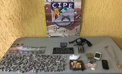 Na operação policial foram apreendidos, 01 Revólver cal. 38, marca Taurus, numeração suprimida, contendo 02 munições intactas e 04 deflagradas, 04 Munições cal. 38, 04 Estojos de munições deflagradas, 204 porções pequenas de maconha, 41 porções pequenas de crack, 10 pedras grandes de crack, 01 porção pequena de cocaína, Material para embalagem de comercialização da droga e 01 balança de precisão.