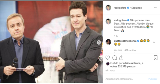 Em uma publicação no Instagram, Rodrigo Faro, apresentador e colega de emissora de Gugu, lamenta ”Não pode ser meu Deus…Não pode ser…Alguém diz que essa notícia não é verdadeira, escreveu na publicação.