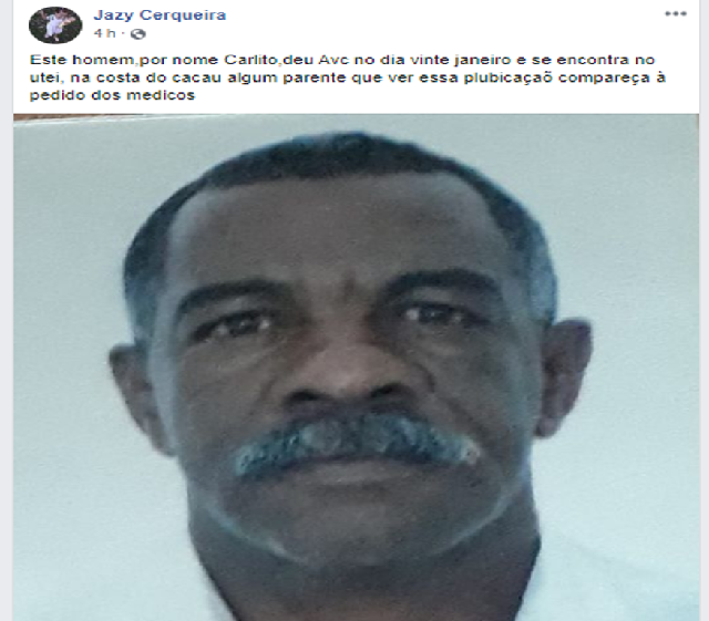 Quem conhecer algum parente do Sr. Carlito, peça para comparecer na recepção ou entrem em contato com a unidade hospitalar, através do telefone: 73/3235-5300
