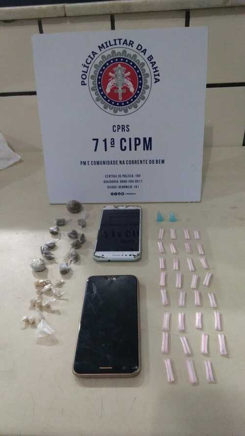 Ao proceder à abordagem policial, foi encontrado com os mesmos, drogas diversas e aparelhos celulares.