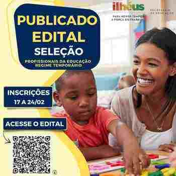 A Prefeitura Municipal de Ilhéus publicou o edital 003/2022 ( veja aqui ), que abre o processo seletivo para a contratação de trabalhadores da educação. Há vagas temporárias para professores, merendeira, serviços gerais e intérprete de libras. As inscrições on-line acontecem de 17 a 24 de fevereiro de 2023, por meio de envio currículo e títulos. São 365 vagas para pro